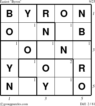 Place each element of the group (B Y R O N) exactly once in each row, each column, and each pentomino.