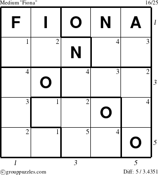 Place each element of the group (F I O N A) exactly once in each row, each column, and each pentomino.