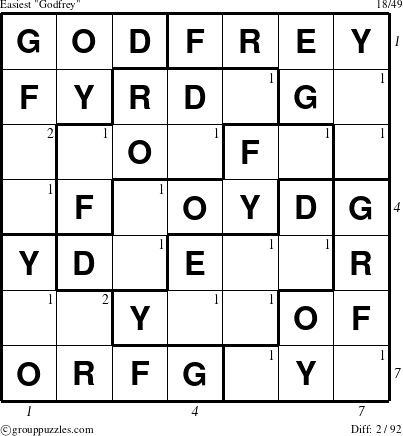 Place each element of the group (G O D F R E Y) exactly once in each row, each column, and each septomino.