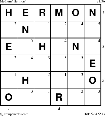 Place each element of the group (H E R M O N) exactly once in each row, each column, and each 3x2 rectangle.