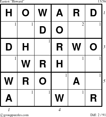 Place each element of the group (H O W A R D) exactly once in each row, each column, and each 3x2 rectangle.
