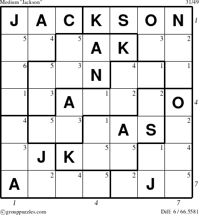Place each element of the group (J A C K S O N) exactly once in each row, each column, and each septomino.
