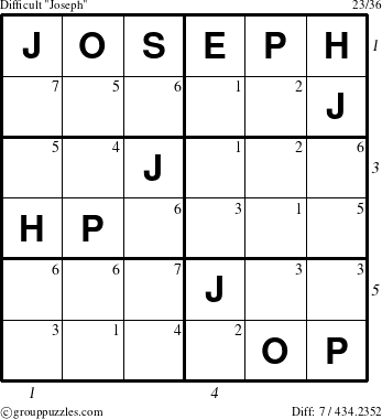 Place each element of the group (J O S E P H) exactly once in each row, each column, and each 3x2 rectangle.