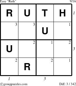 Place each element of the group (R U T H) exactly once in each row, each column, and each 2x2 square.