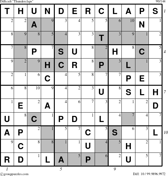 Place each element of the group (T H U N D E R C L A P S) exactly once in each row, each column, each 4x3 rectangle, each eye, and the elements that make up the smile.