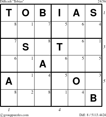 Place each element of the group (T O B I A S) exactly once in each row, each column, and each 3x2 rectangle.