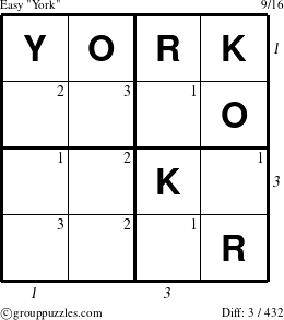 Place each element of the group (Y O R K) exactly once in each row, each column, and each 2x2 square.